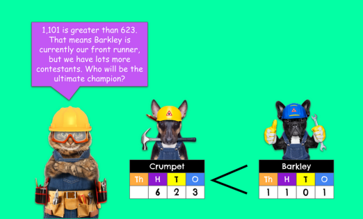 Through visuals, students will explore how each place value column is 10x greater than the last and use this knowledge to regroup amounts. They will find the real value of the animals’ place value pictures.
