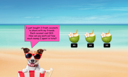 This lesson focuses on using place value dots/counters to multiply 2-digit numbers by 1-digit numbers. This strategy helps students visualise multiplication as repeated addition. Students will help animals calculate their beach spending totals.