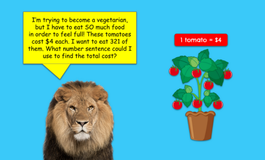Students will continue to use partial product strategy to solve 3-digit x 1-digit number sentences. Students will use the strategy to calculate the cost of each lion’s lunch.
