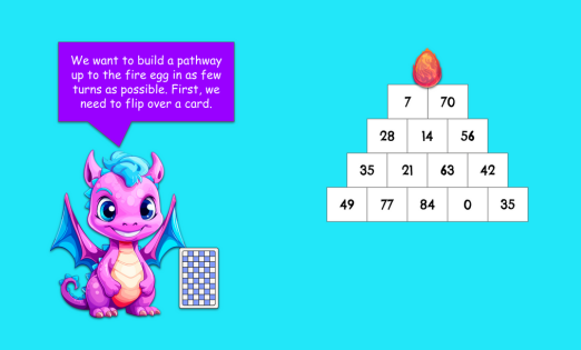 Students will revisit the strategies learned throughout this unit and apply them to develop an effective approach for multiplying by 7, reinforcing their understanding and problem-solving skills. They will practice multiplying by 7 by playing a game where they find a pathway to the Fire Egg.
