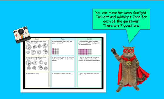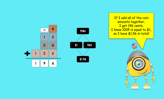 Students will calculate groups of coins or notes with the same value and compare money amounts. They will also regroup cents for dollar amounts. Students will calculate groups of money by playing a game called Money Mania.