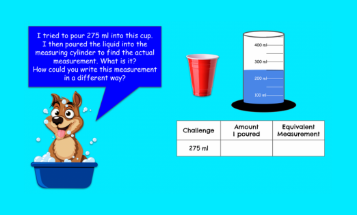Students will continue measuring capacity/volume and converting between millilitres and litres. They will take part in different pour challenges.