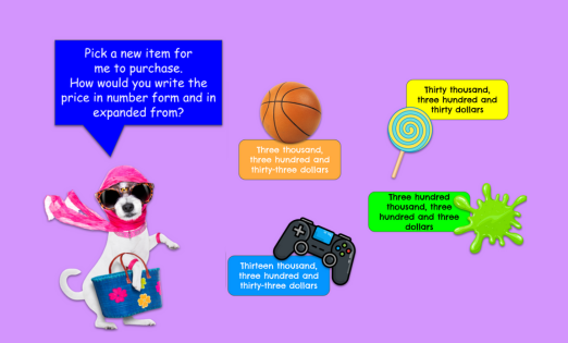 Students will practice writing large numbers in written form by writing cheques. They will explore when to use hyphen/commas and use the ‘hotel’ technique for support.